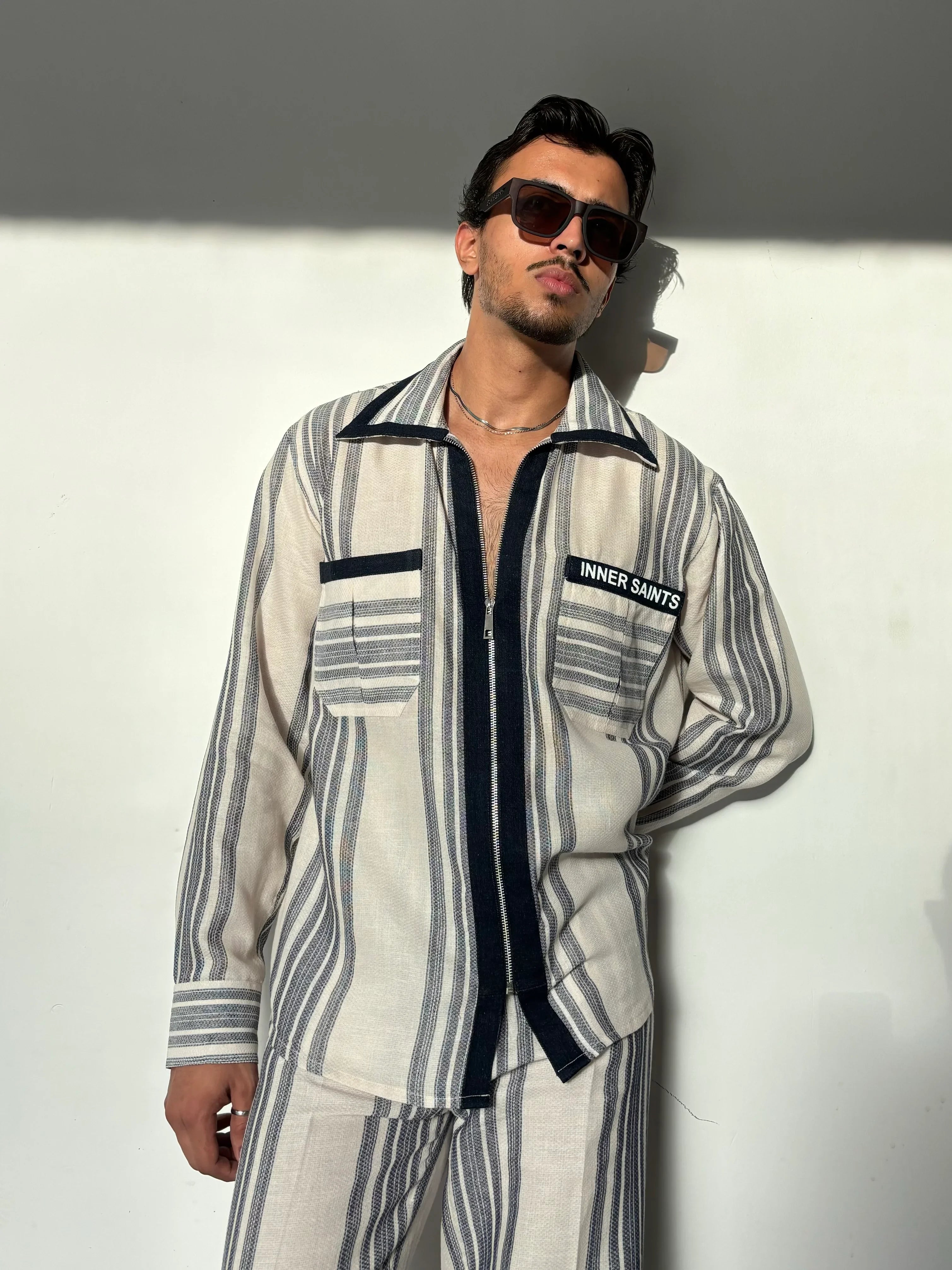 Enjoy this Navy striped cotton shirt & relaxed fit pants this summer. It can be styled as elevated casual to fun events. The trims used are superior quality silver metallic zips & buttons. Overall the set is very versatile both upper & bottoms can be styled on their own as separates.